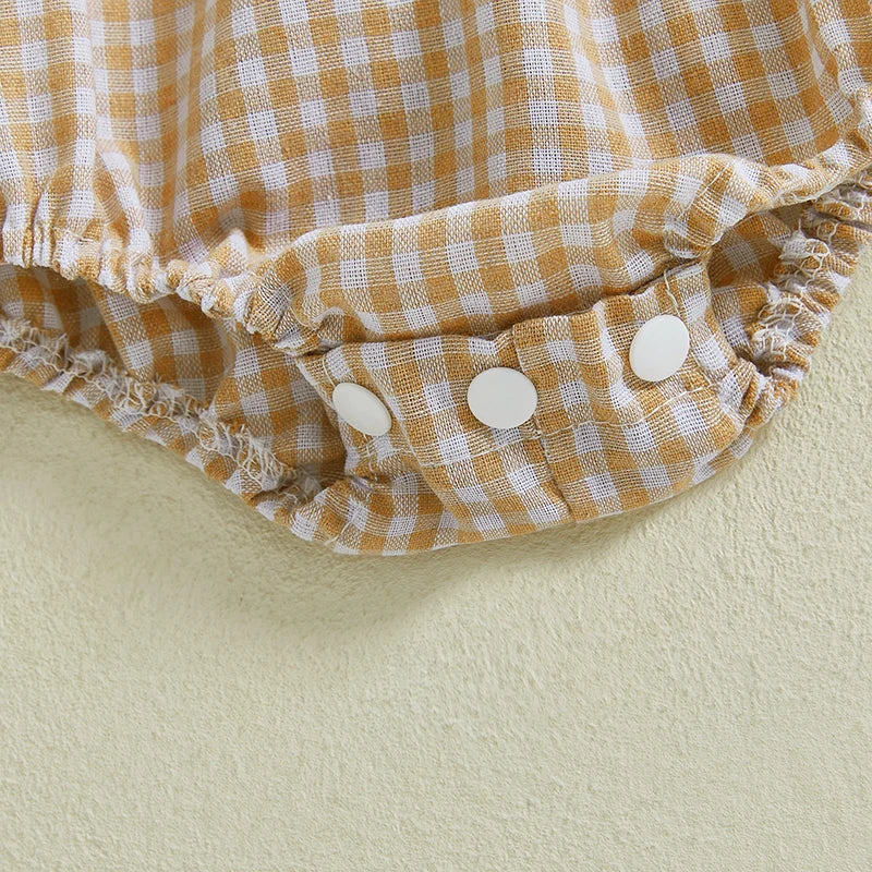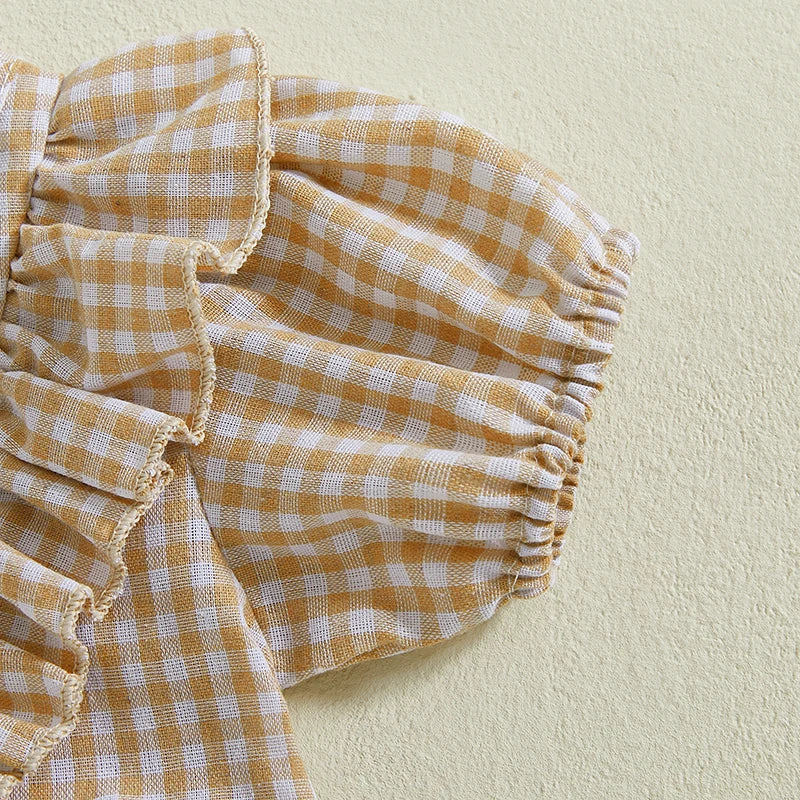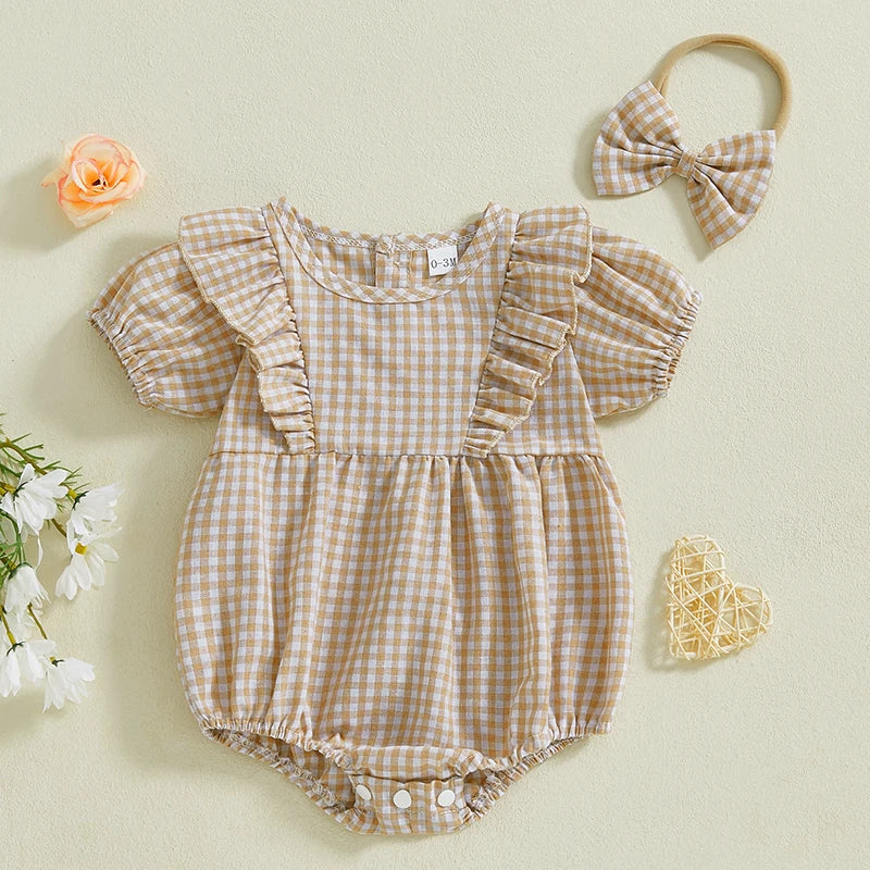 Baby Girls Summer Sweet Romper Flying Sleeve Round Neck Plaid Romper with Headband