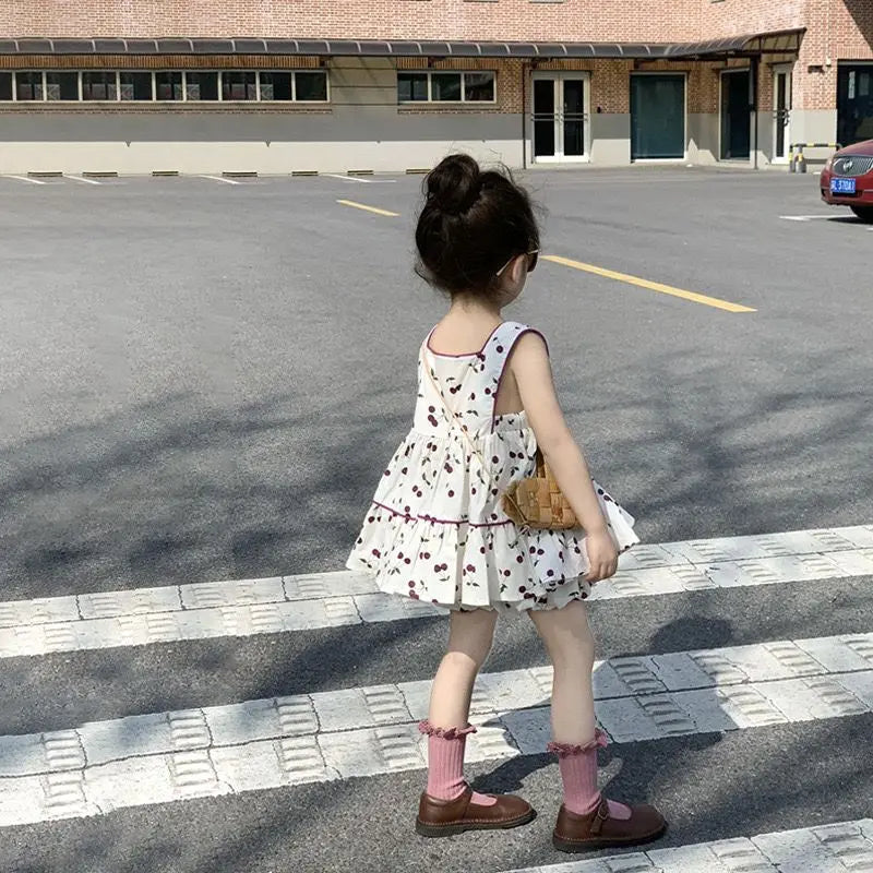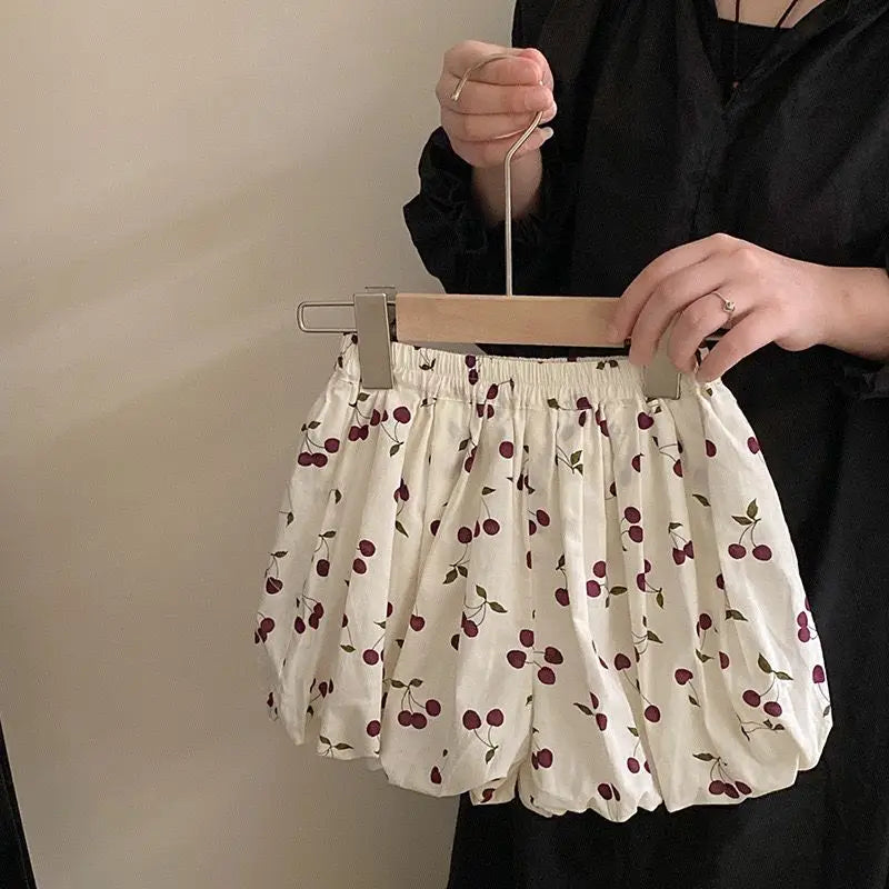 Kids Summer Clothing Set Girls Cherry Print Square Collar Loose Shirt+Elastic Waist Shorts 2-8Y Children 2Pcs Cute Clothes Suit