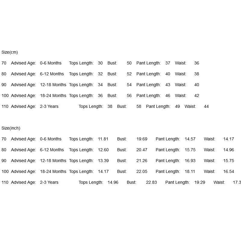 70 Advised Age: 0-6 Months Tops Length: 11.81 Bust: 19.69 Pant Length: 14.57 Waist: 14.17